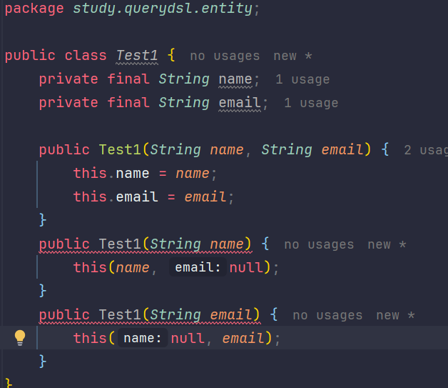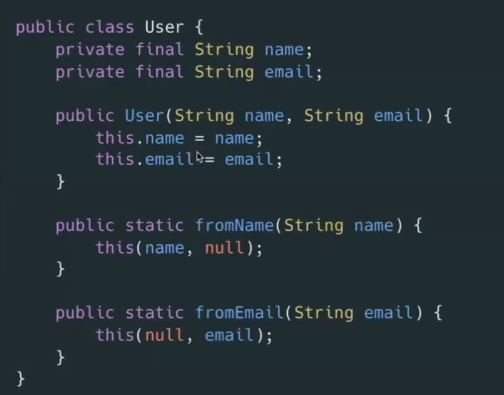 - 만약 하나의 파라미터만 있어도 생성되게 만들고 싶으면 생성자로는 안되는 케이스가 있음(매개변수 타임과 함수명이 같아서)