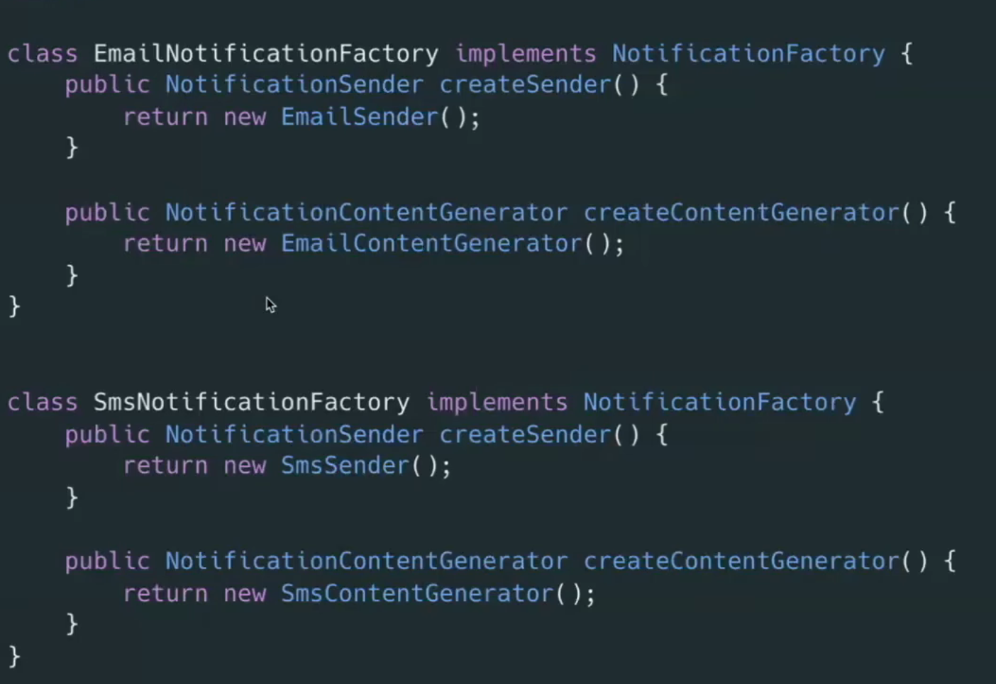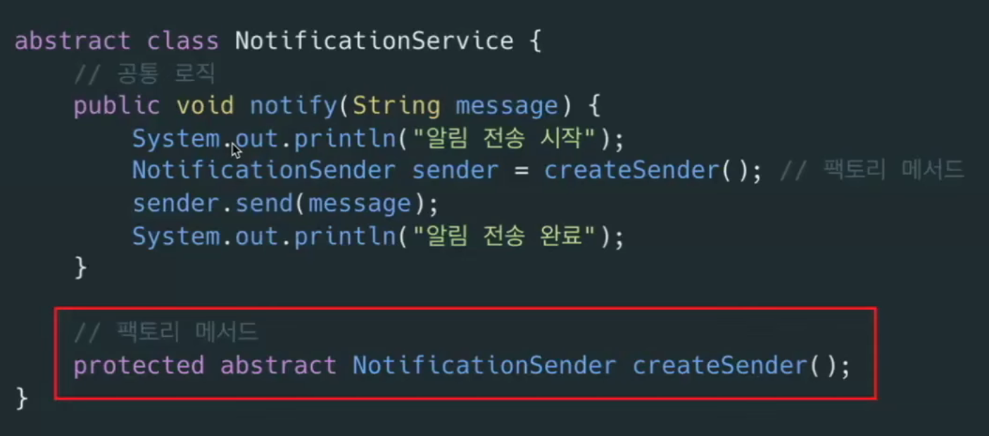 - 상위클래스가 객체 생성을 위한 메서드 정의만 제공하고, 하위클래스가 실제로 생성을 구현하는 패턴